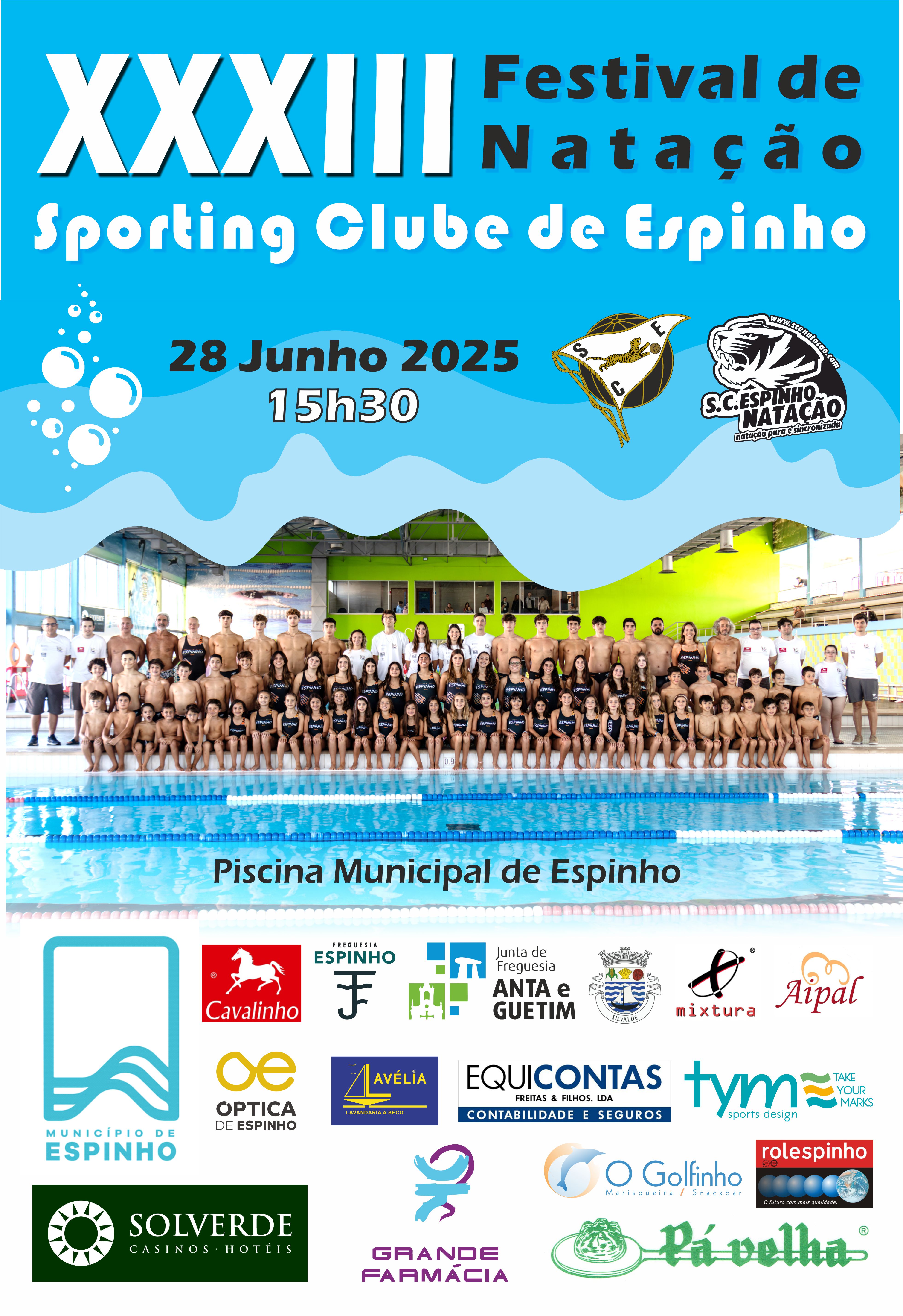 No próximo sábado, dia 28 de junho, às 15h30, irá realizar-se o XXXIII Festival de Natação do Sporting Clube de Espinho. Estarão presentes cerca de 80 nadadores das classes de natação pura, natação artística, natação adaptada e natação master.